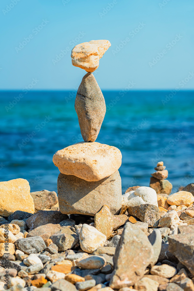 Balanced stack of stones on rocky beach, ocean and blue sky in background, harmony concept