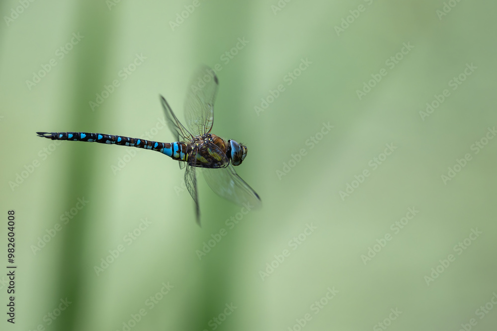 Southern hawker, Aeshna cyanea, in flight over water, dragon fly