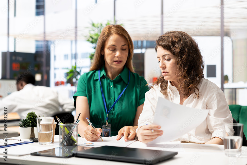 Team of HR workers identifying right candidates for job opening, reviewing resumes to determine candidate qualifications. Teamworking colleagues doing screening process, selecting skilled people
