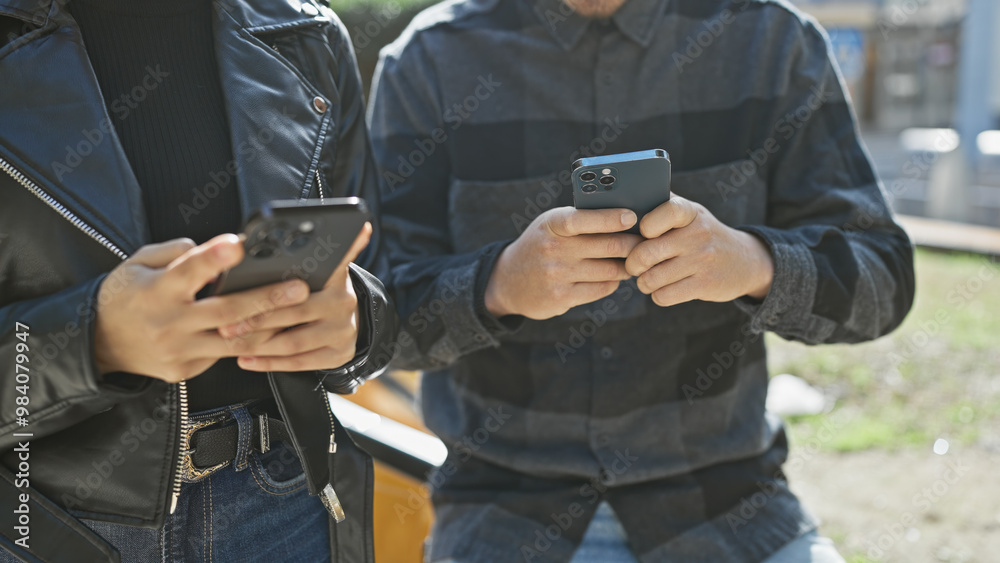Close-up of a young couple engrossed in their smartphones on a sunny urban street.