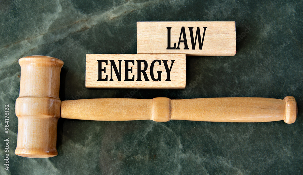 ENERGY LAW - words on wooden blocks on a green background with a judge's gavel