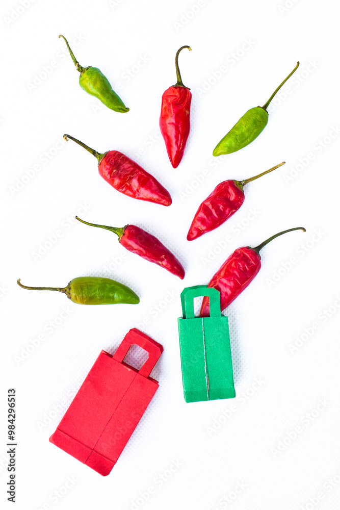 red hot chili peppers in air with shopping bag with green isolated on white background, Red chili pepper with chili splashing elements