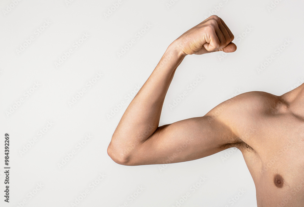 Young thin man arm on a grey background. Weak man muscle flexing. Skinny man goes in for sports, builds muscles. Man shows small biceps. Man is preparing for training. Sport and health concept