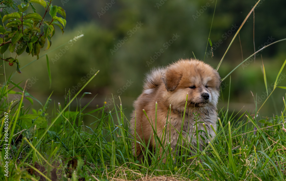 portrait d'un petit chiot akita poil long, dans la nature un soir de printemps