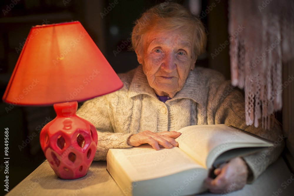 An elderly woman with a night lamp reading a book.