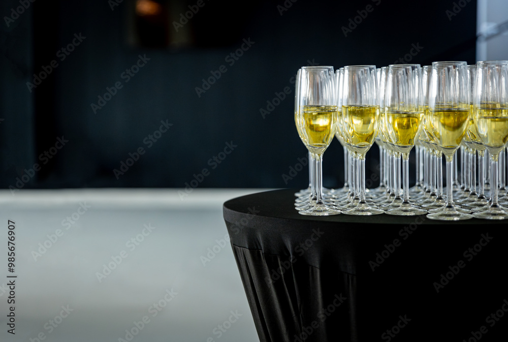 Welcome glasses of champagne waiting to be served and drunk by guests celebrating an important event at a banquet