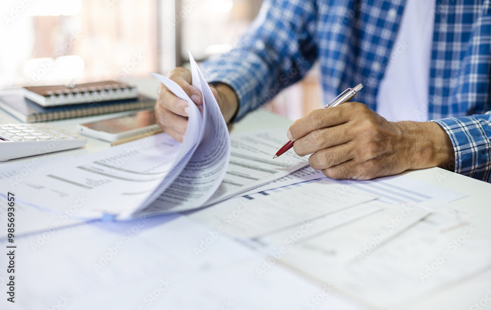 Asian man hands holding pen checking business document and various bills calculate income and expenses after start new business owner