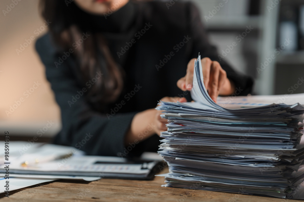 Buried in Paperwork: A businesswoman's hands sift through a towering stack of documents, her face obscured by the sheer volume of paperwork. A relatable image of deadlines and office life.