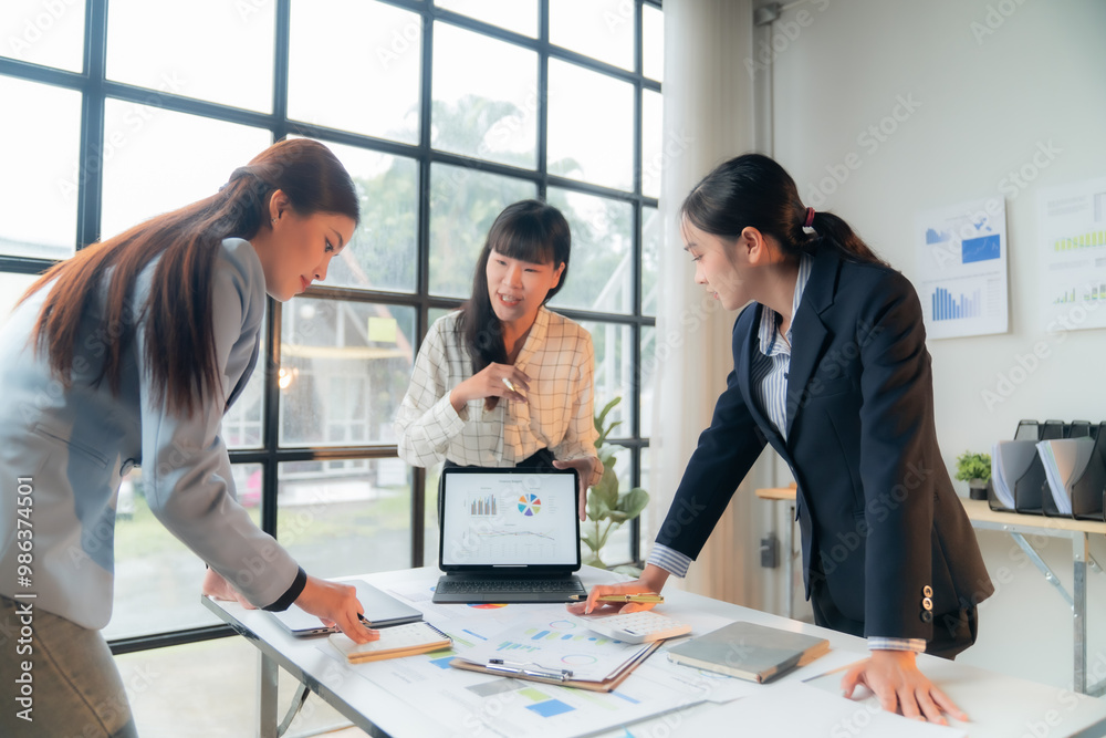 Three asian businesswomen collaborate on a laptop, analyzing charts and discussing marketing tactics in a bustling office