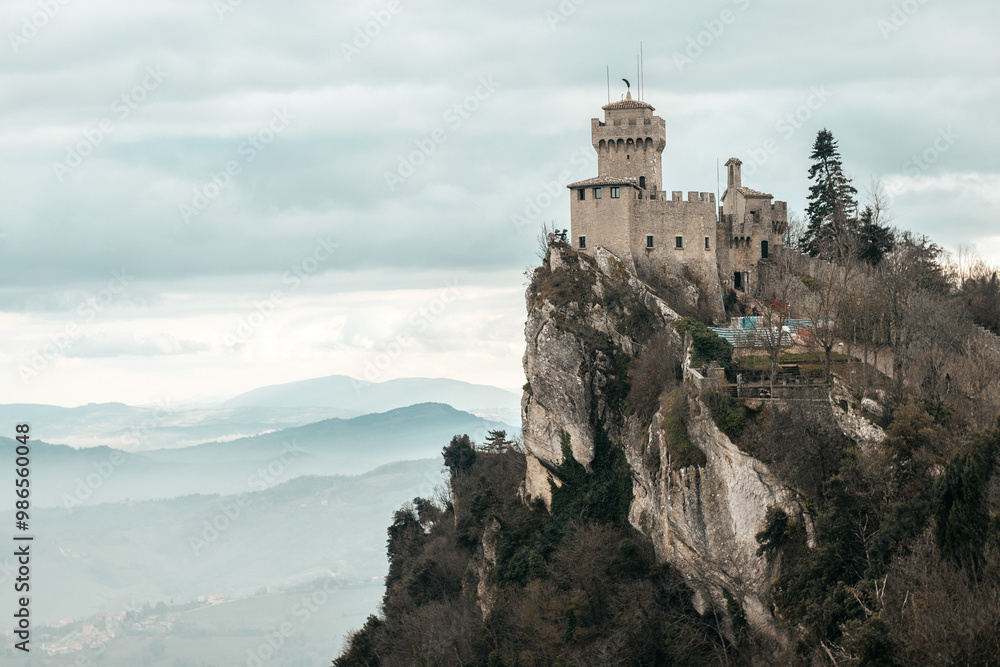 Guaita Tower in San Marino on a Cliff with Dramatic Clouds and Scenic Mountain Views
