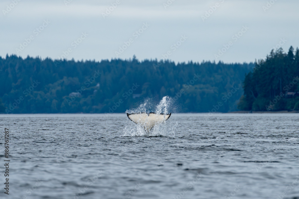 Orca tail fin splashing as it dives down into the water of the puget sound
