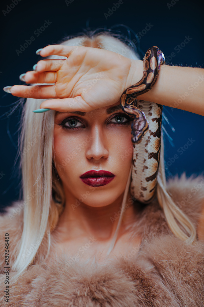 Young blond woman with small snake fashion portrait