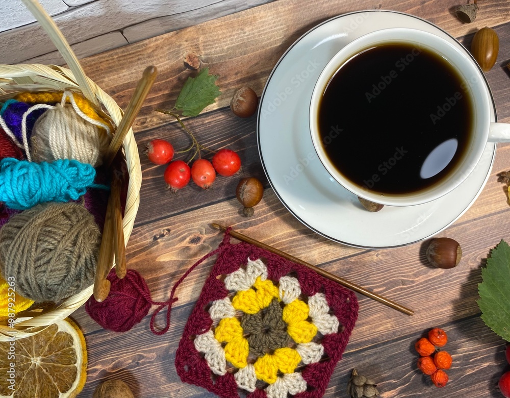 Cozy autumn photo with a cup of coffee, flashlight, crocheting, leaves and autumn decor