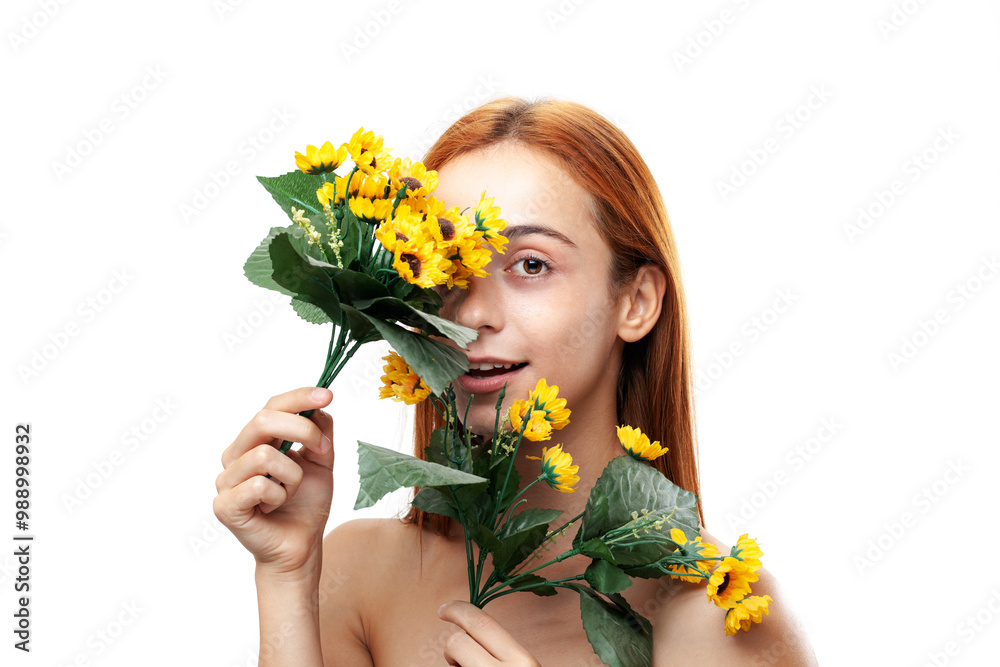 A vibrant portrait of a young redhead woman smiling subtly while holding a fresh bouquet of yellow flowers, set against a white background.