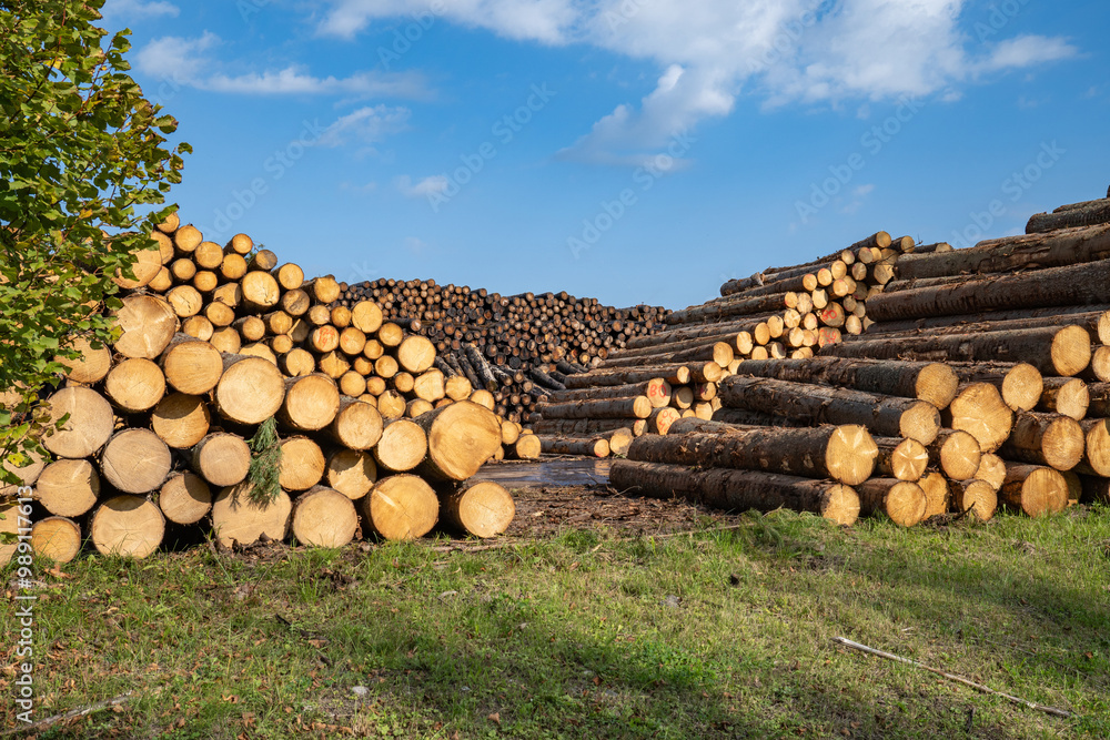Spruce trees. Log trunks pile, the logging timber wood industry.