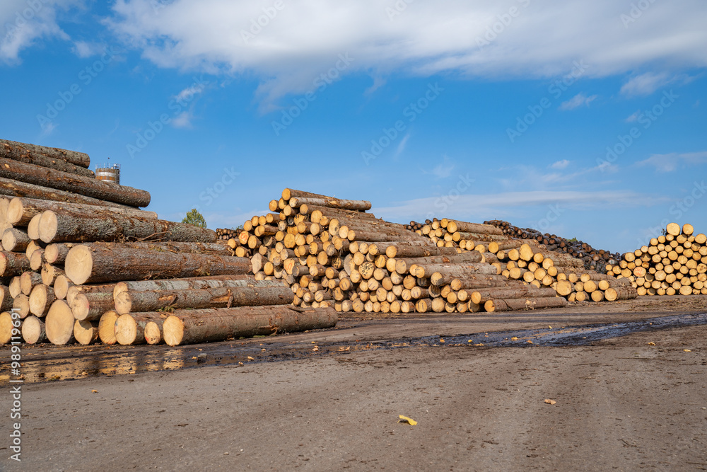 Spruce trees. Log trunks pile, the logging timber wood industry.