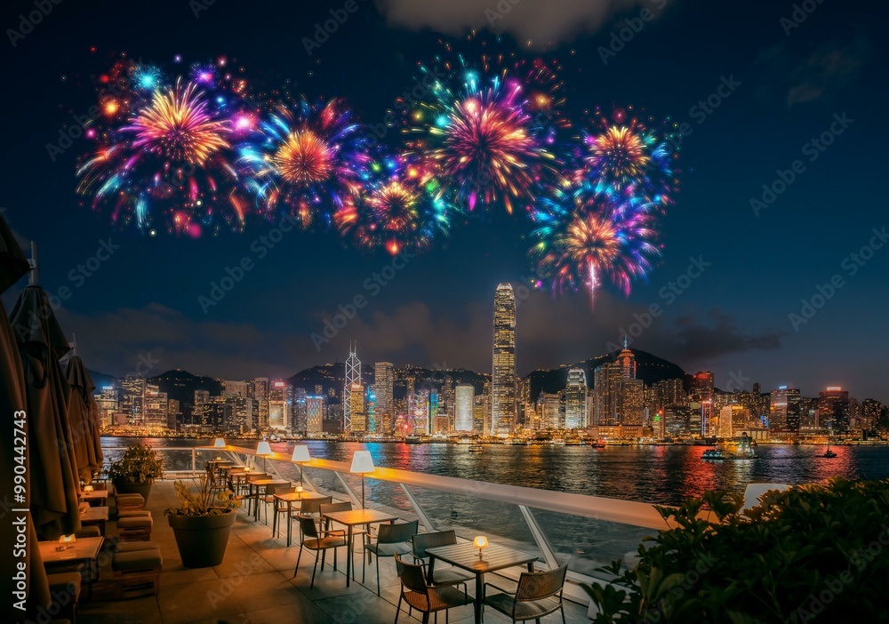 Nighttime view of Hong Kong skyline with fireworks over water and an outdoor patio with tables and chairs.