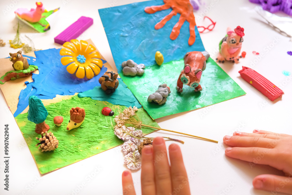 Child smearing colorful plasticine on cardboard and creating fairy tale card with cartoon animals, using nature details also, dry flowers, cone, leaves