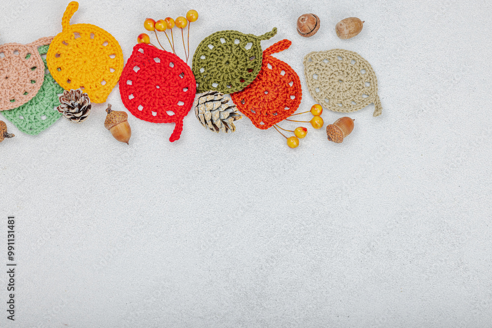 Set of clew of thread for knitting. Crocheted different leaves, handmade, autumn hobby concept