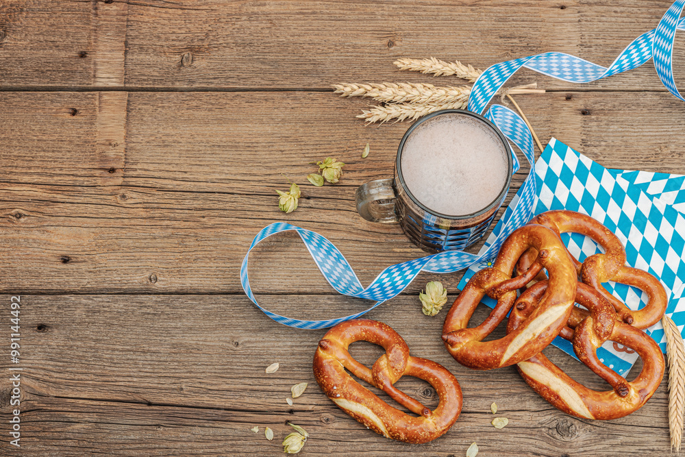 Traditional Oktoberfest set. Pretzels and beer, German festival food concept. Trendy hard light