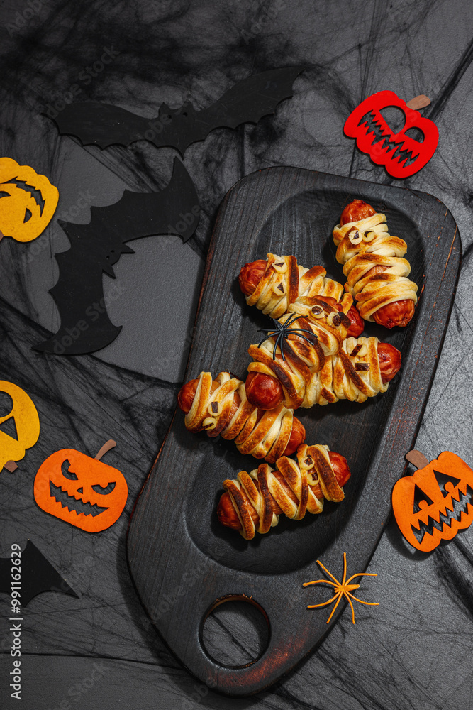 Spooky sausage mummies for Halloween party. Funny seasonal food, homemade baking, traditional decor