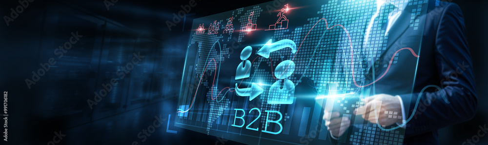 Businessman meticulously analyzing data on a computer, observing a graph and charting sales volume with a projected growth chart, indicating a successful strategy for B2B business to business.