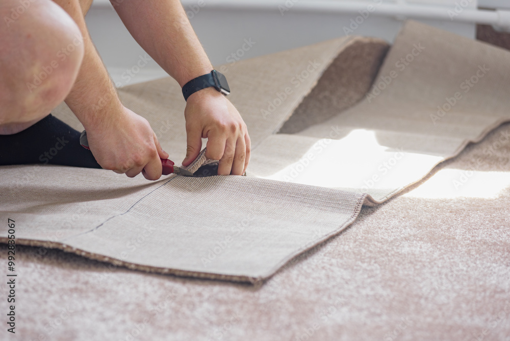 Male hands cutting carpet with blade during apartment renovation. Man in action during apartment repair, focused on cutting and fitting carpet professionally