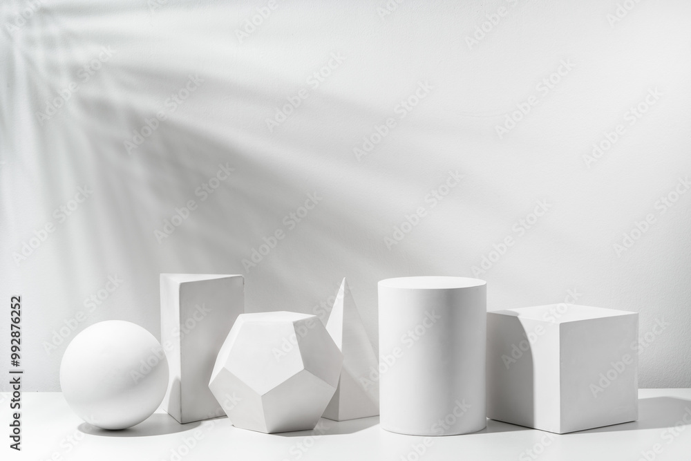 A collection of white geometric shapes arranged on a table in a bright studio setting
