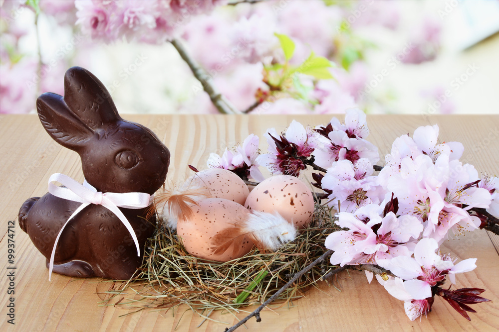 Easter background, card with easter eggs, chocolate bunny and pink spring blossoms