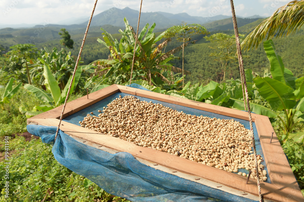 Coffee beans dried in the sun, Coffee beans raked out for drying prior to roasting