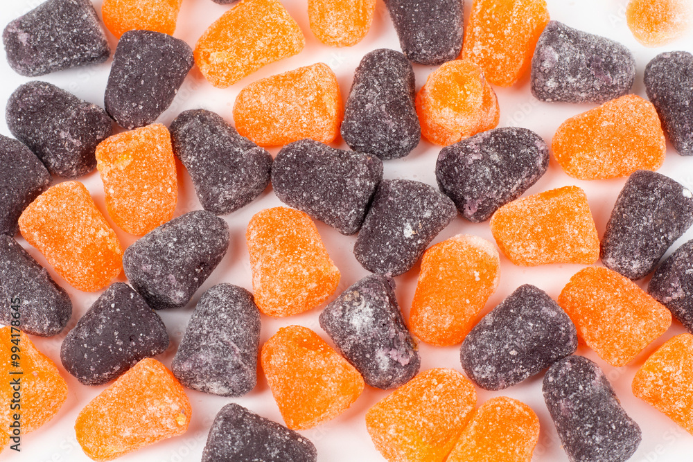 Halloween Candy Orange and Black Spice Drop Gummies Flat Lay Isolated on White