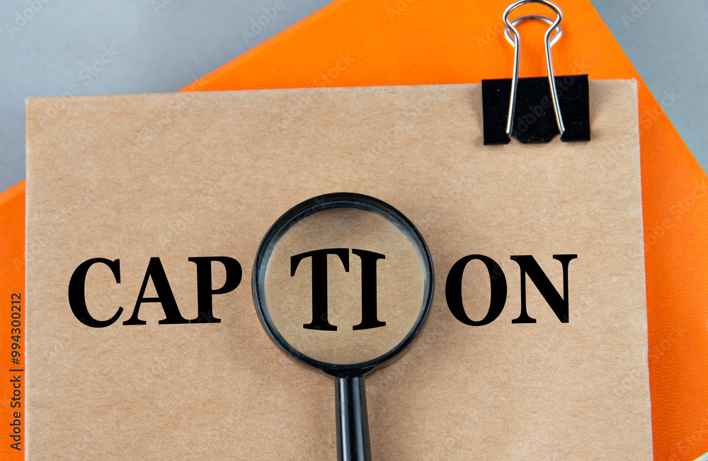 CAPTION - word on a brown sheet with a magnifying glass in the center