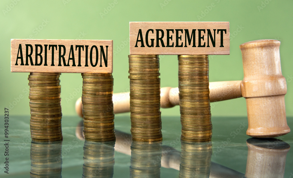 ARBITRATION AGREEMENT - word on a white sheet with a judge's gavel and a stack of coins in the background