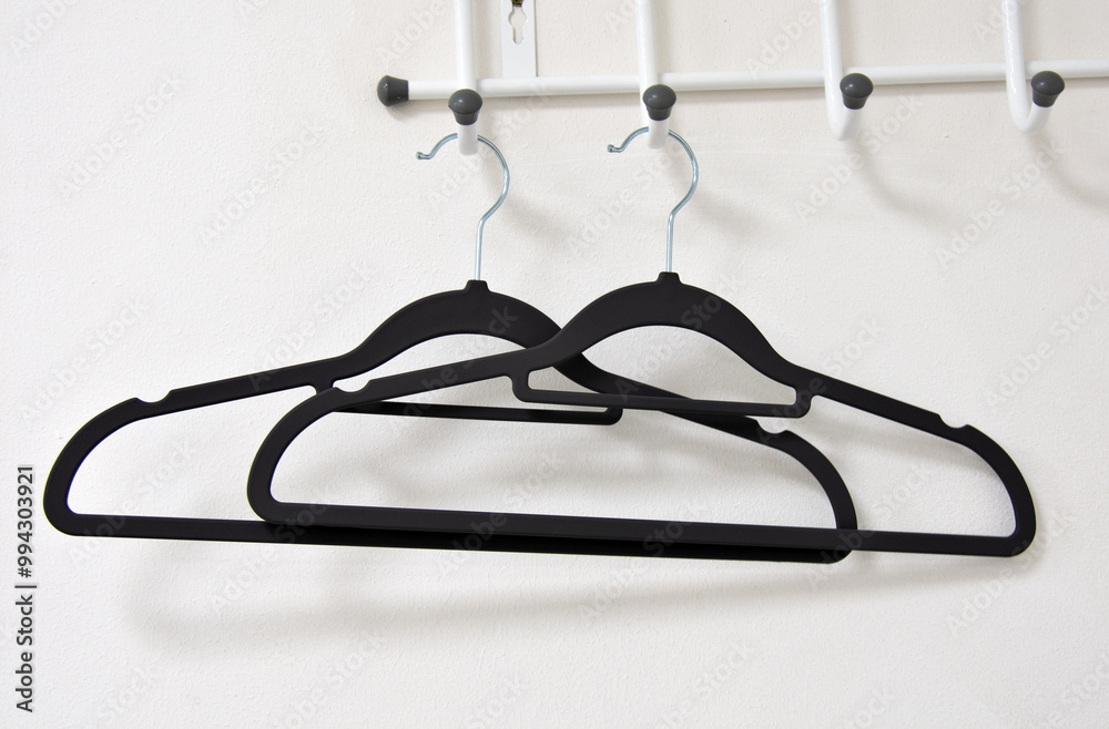 Two black hangers hanging on hooks