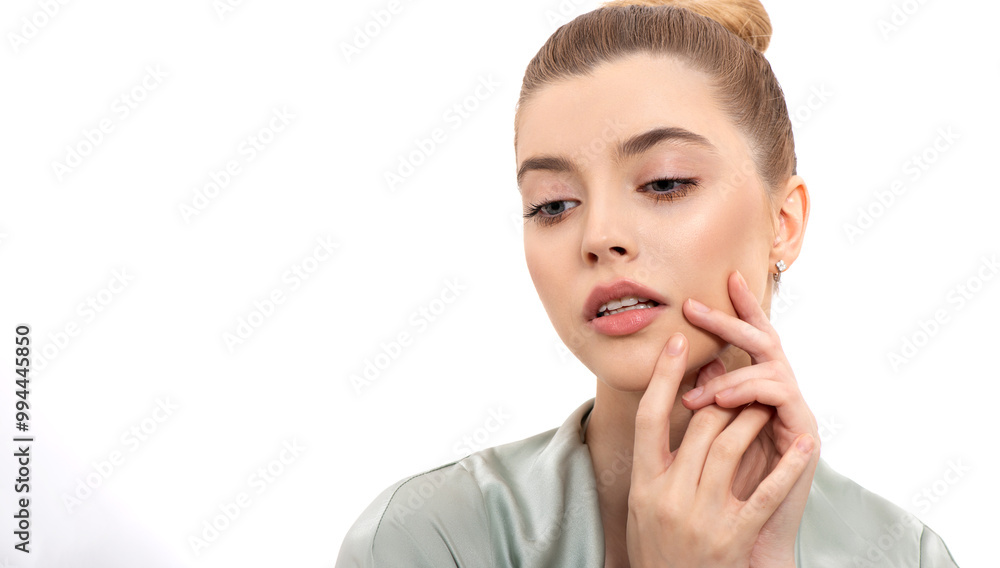 Beautiful young woman with clean perfect fresh skin touching her face. Portrait of beauty model with natural make up, formed eyebrows and long eyelashes. Spa, skincare and wellness
