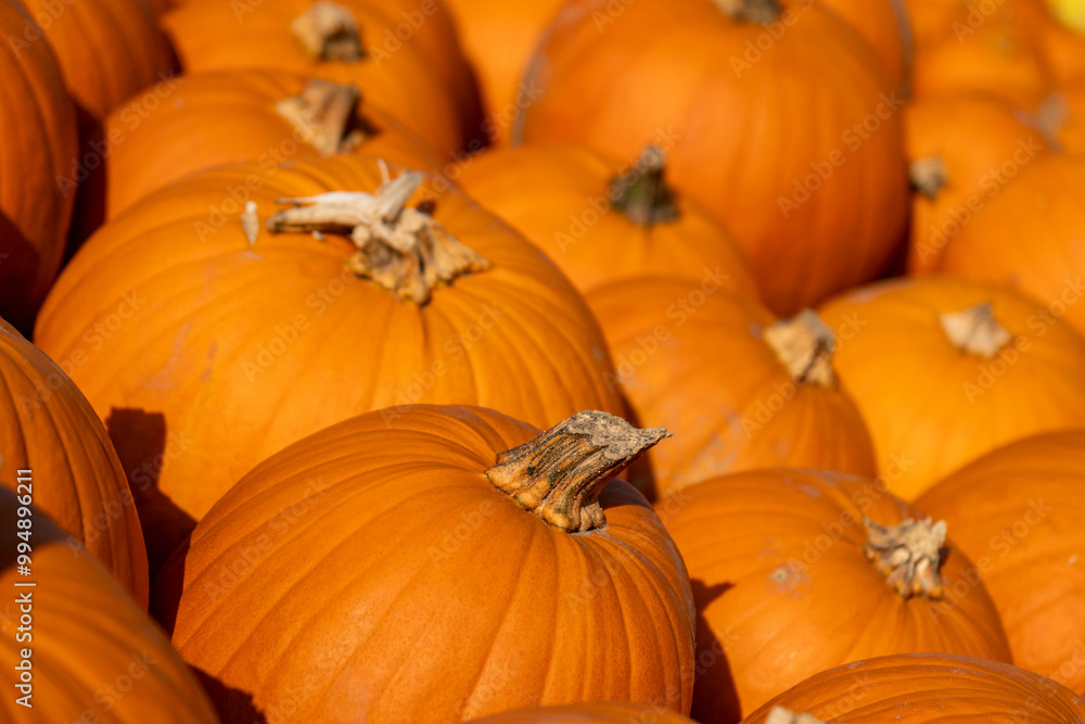 Lots and lots of stacked, freshly picked, classic halloween pumpkins. These pumpkins will soon be on the market stalls and will probably turn into lanterns.