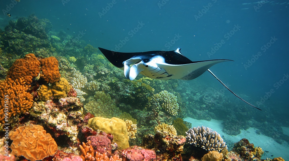 A majestic manta ray glides gracefully through the clear blue water over a vibrant coral reef.