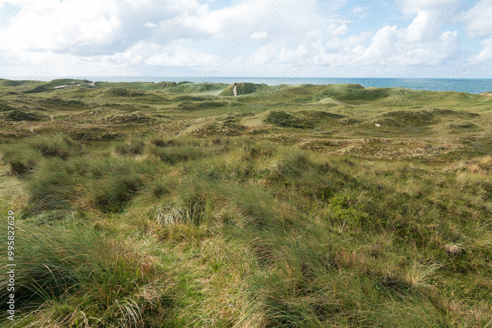 Nordseeküste mit grünen Dünen und Blick über das Meer