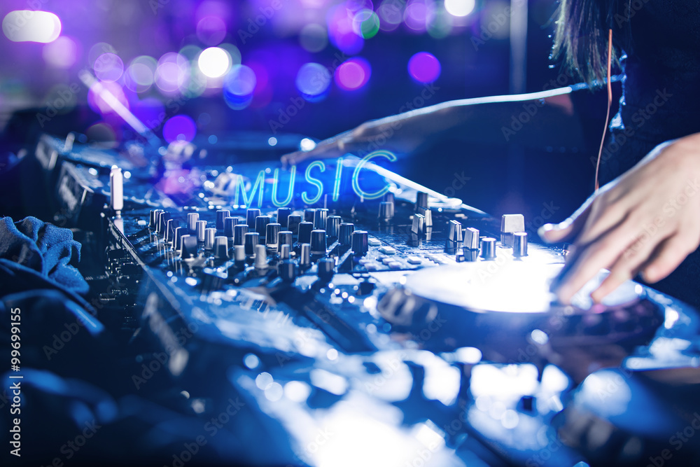 Dj mixes the track in the nightclub.