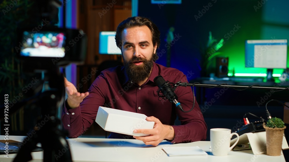 Expert filming packaged product unboxing for technology vlog using professional camera. Influencer urging fans to buy sponsoring partner merchandise, recording video with high quality gear, camera A