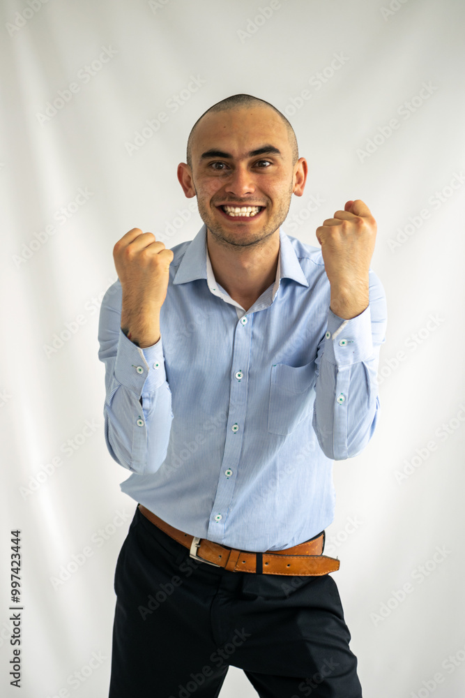 Very cheerful and euphoric young man celebrating by clenching his fists