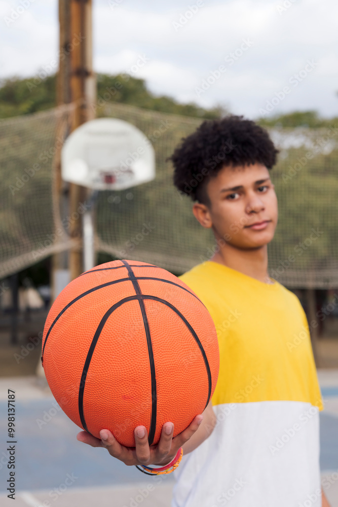 latin teen player showing basket ball standing on sports ground and looking at camera, concept of youth and urban lifestyle, selective focus on the ball