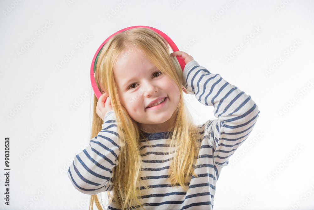 Little happy girl listening music on headphones