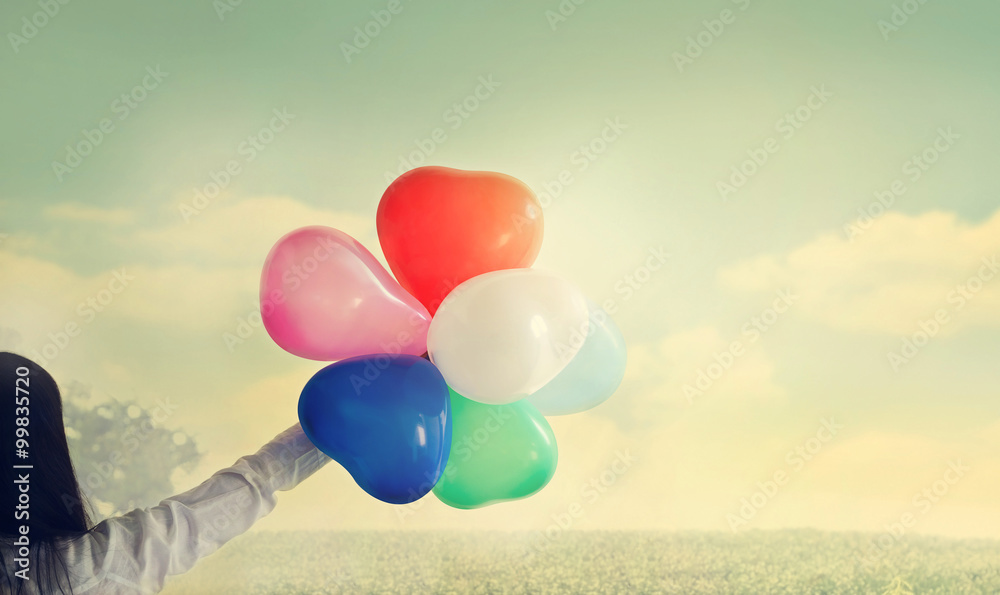 Vintage heart balloon shape with colorful in hand of woman, outdoor