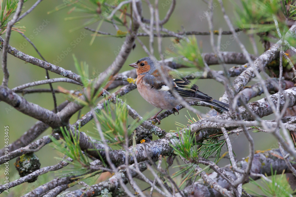 Pinzón Vulgar Fringilla coelebs entre ramas y hojas de pino del bosque, Alcoy, España