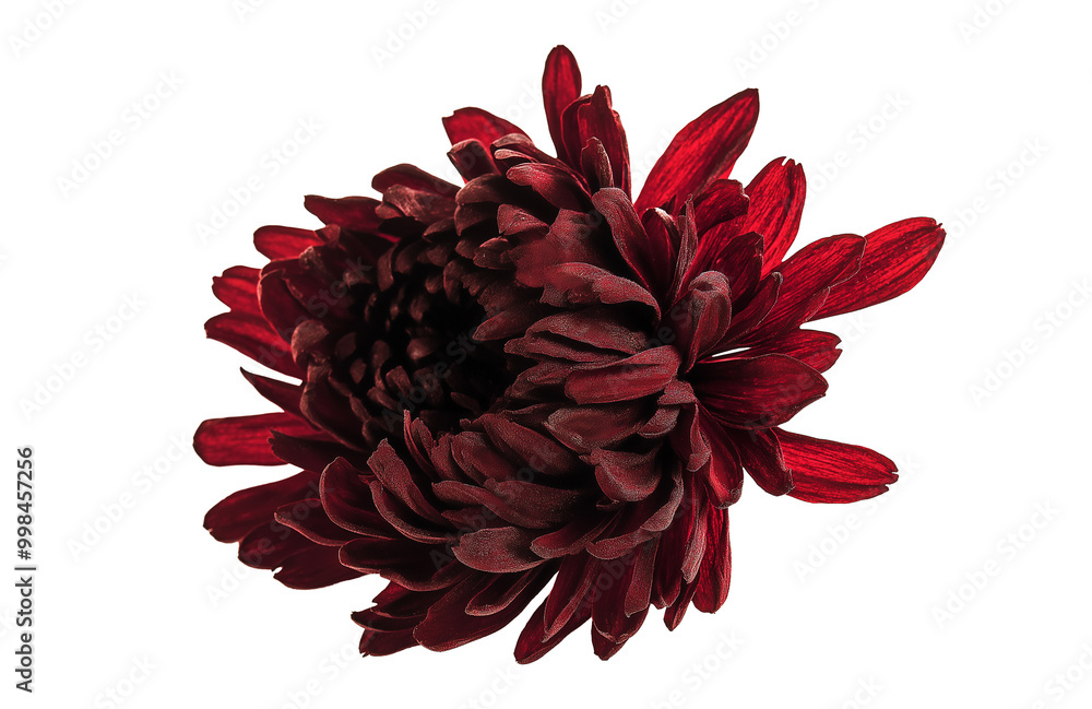 Deep red dried chrysanthemum flower bloom image isolated transparent. Floral layered petals rich texture cut out photo png. Autumn-inspired decor cutout element object photography