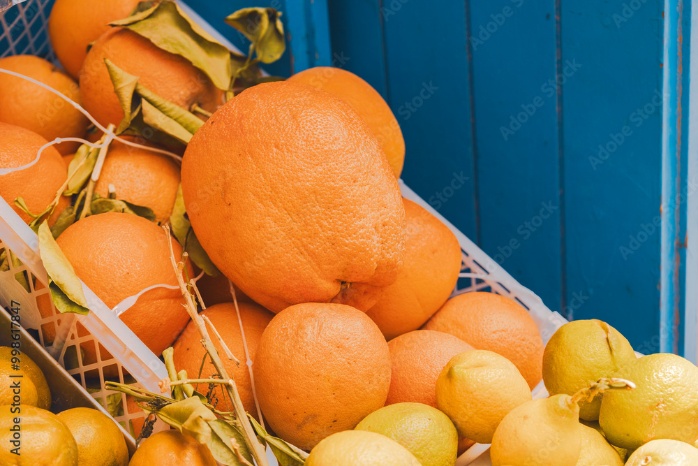 Fresh citrus fruit display at a vibrant juice stall with ripe, grapefruit, oranges, lemons, and limes outdoor juice stand, street market stall, featuring local produce, Essaouira, Morocco
