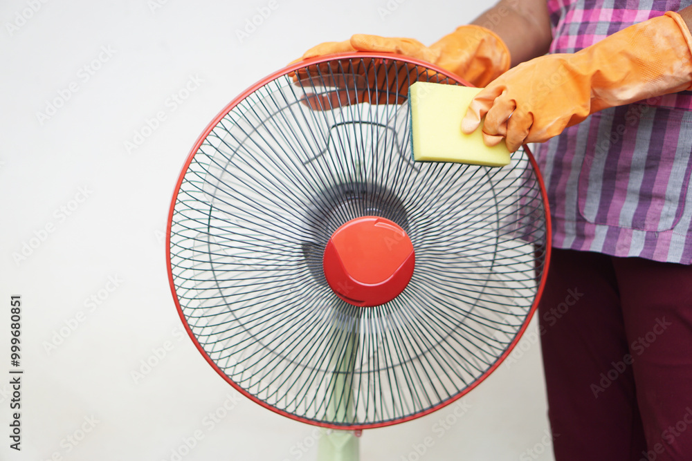 Close up hands wear gloves, hold sponge to clean electric fan. Concept, Appliance maintenance and repair for long using. Clean dust on fan to stop allergy for hygiene. Chore and household keeping.