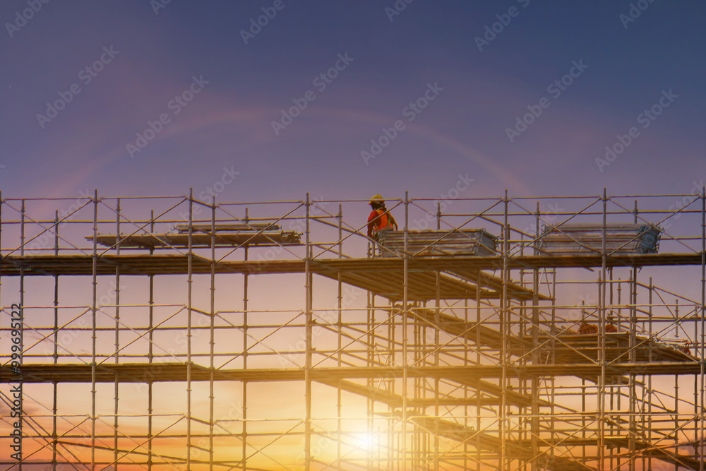 Scaffolding pipe clamp and parts,construction site with scaffold and building strength to scaffold clamps in used on construction site with sunset background,scaffolding for construction factory
