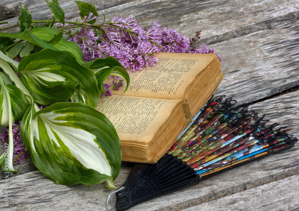 ветка персидской сирени на старой книге и веер на деревянном фоне